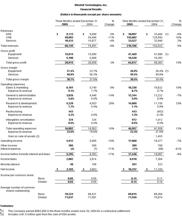 Westell reported net income for the December 2005 quarter of $3.2 million, or $0.04 per diluted share, which includes income tax expense of $2.1 million, or $0.03 per diluted share. For the September 2005 quarter the Company reported net income of $3.0 million, or $0.04 per diluted share including $2.1 million income tax expense, or $0.03 per diluted share. During the third quarter of last fiscal year, the Company reported net income of $3.7 million, or $0.05 per diluted share including $2.6 million income tax expense, or $0.04 per diluted share.